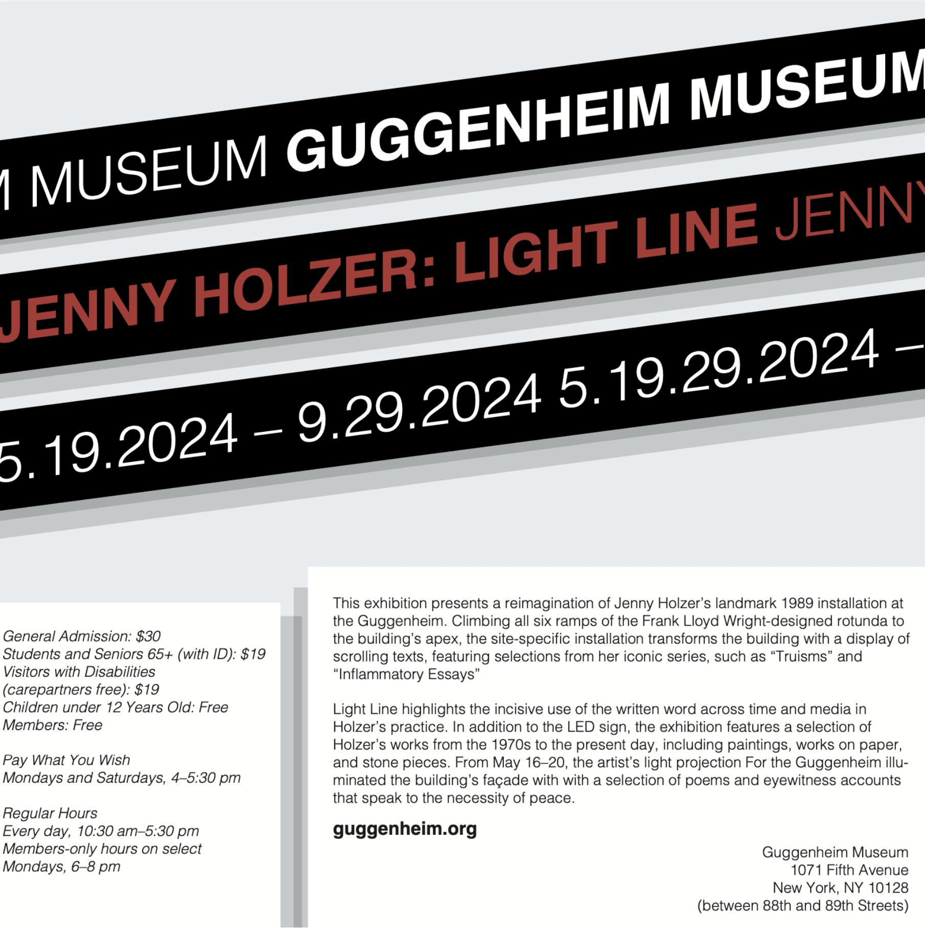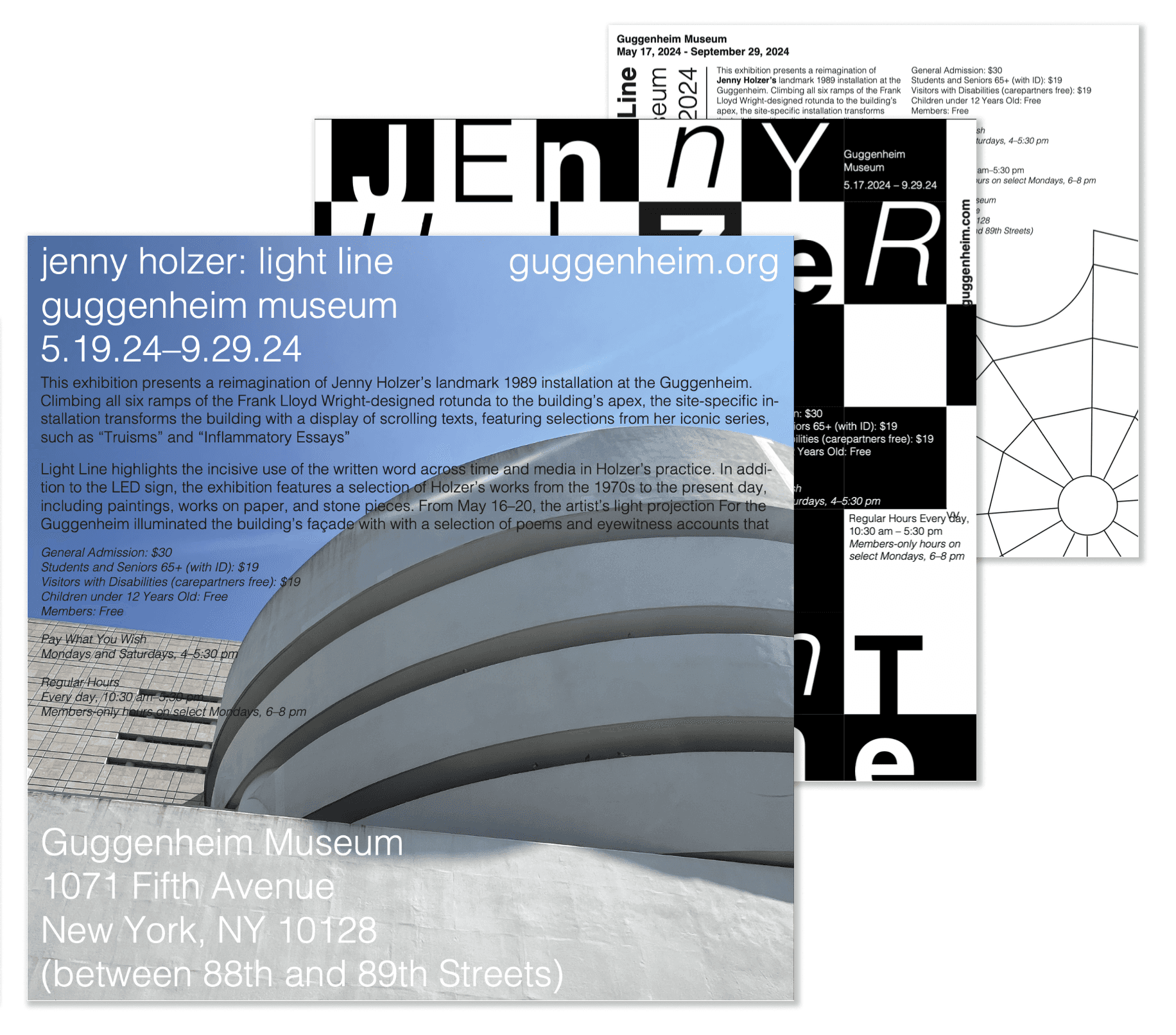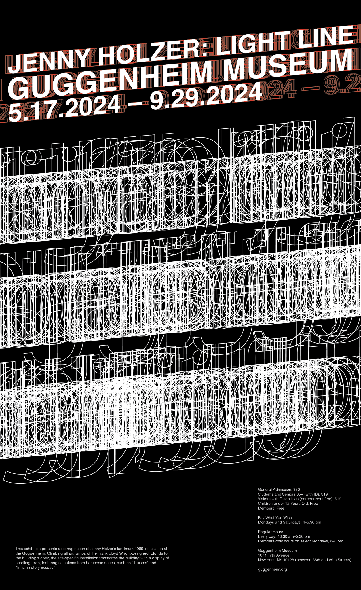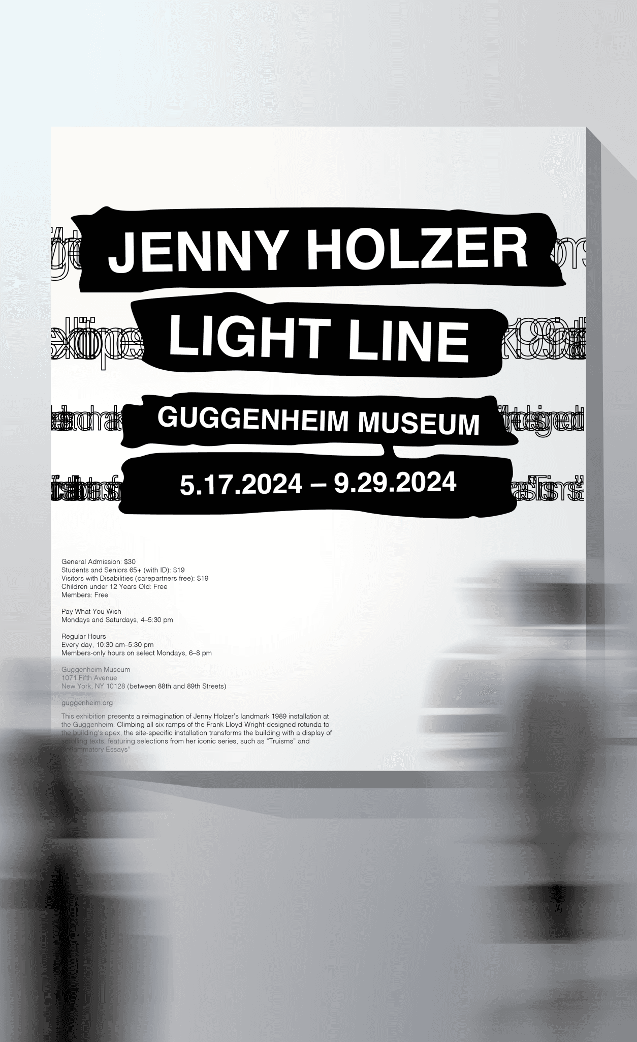 For this work, I visited, photographed, and interacted with Jenny Holzer’s exhibition Light Line over the course of three months in order to develop compelling compositions and posters.