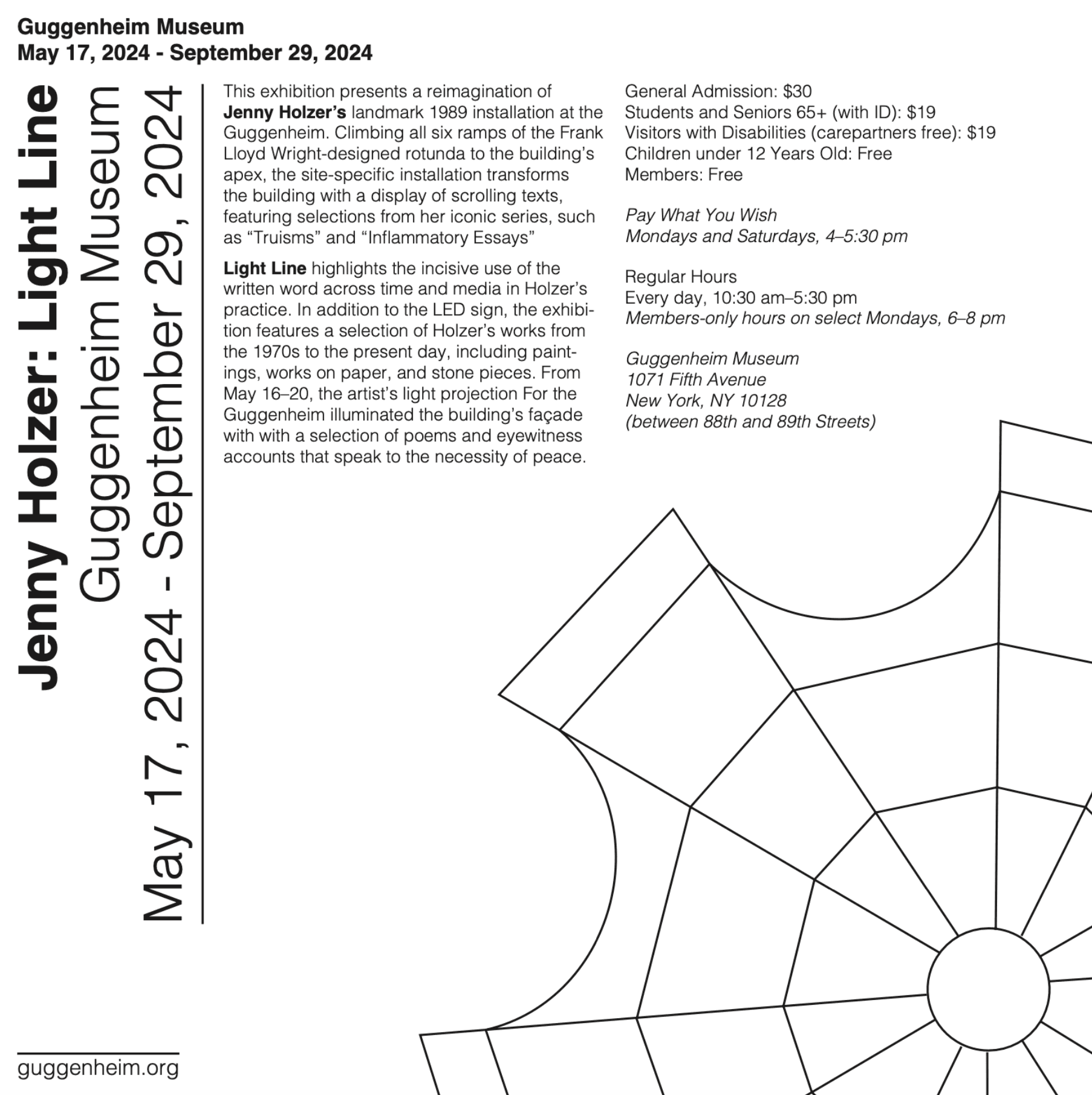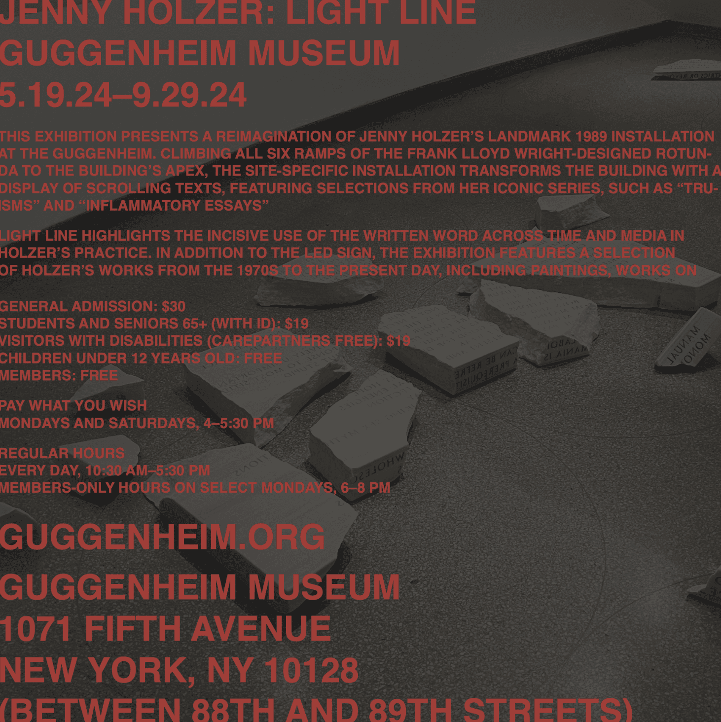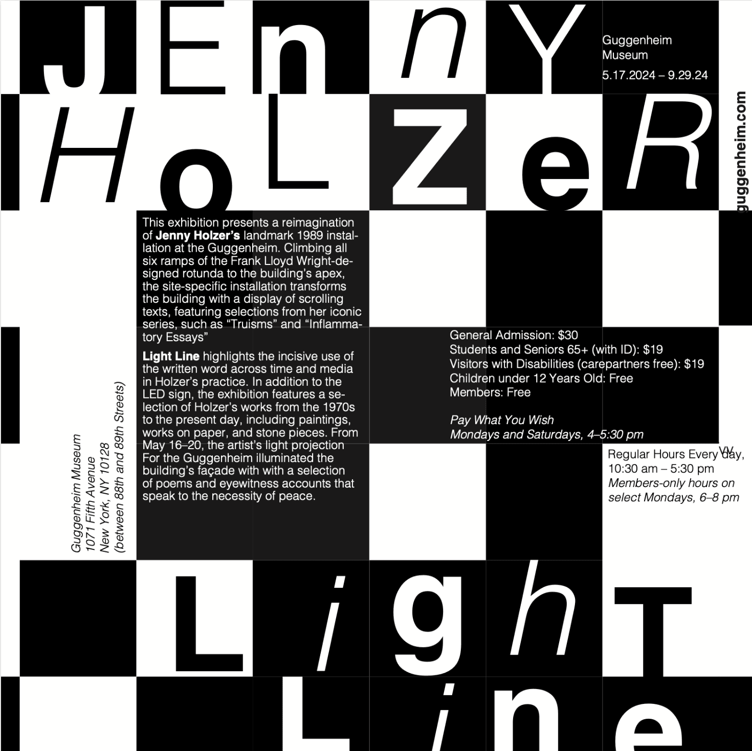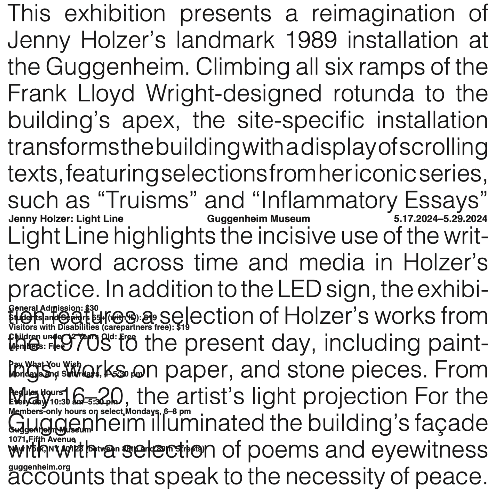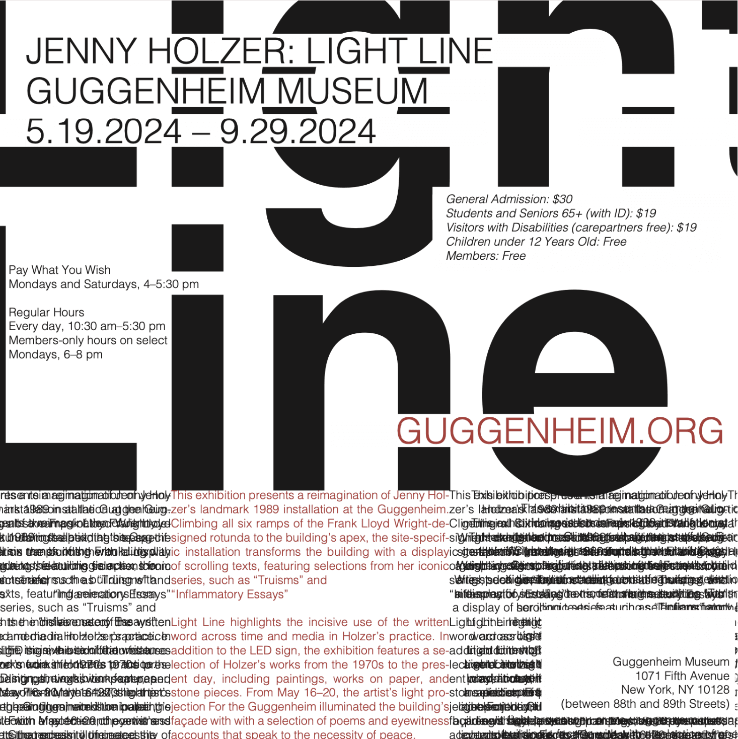 For this work, I visited, photographed, and interacted with Jenny Holzer’s exhibition Light Line over the course of three months in order to develop compelling compositions and posters.